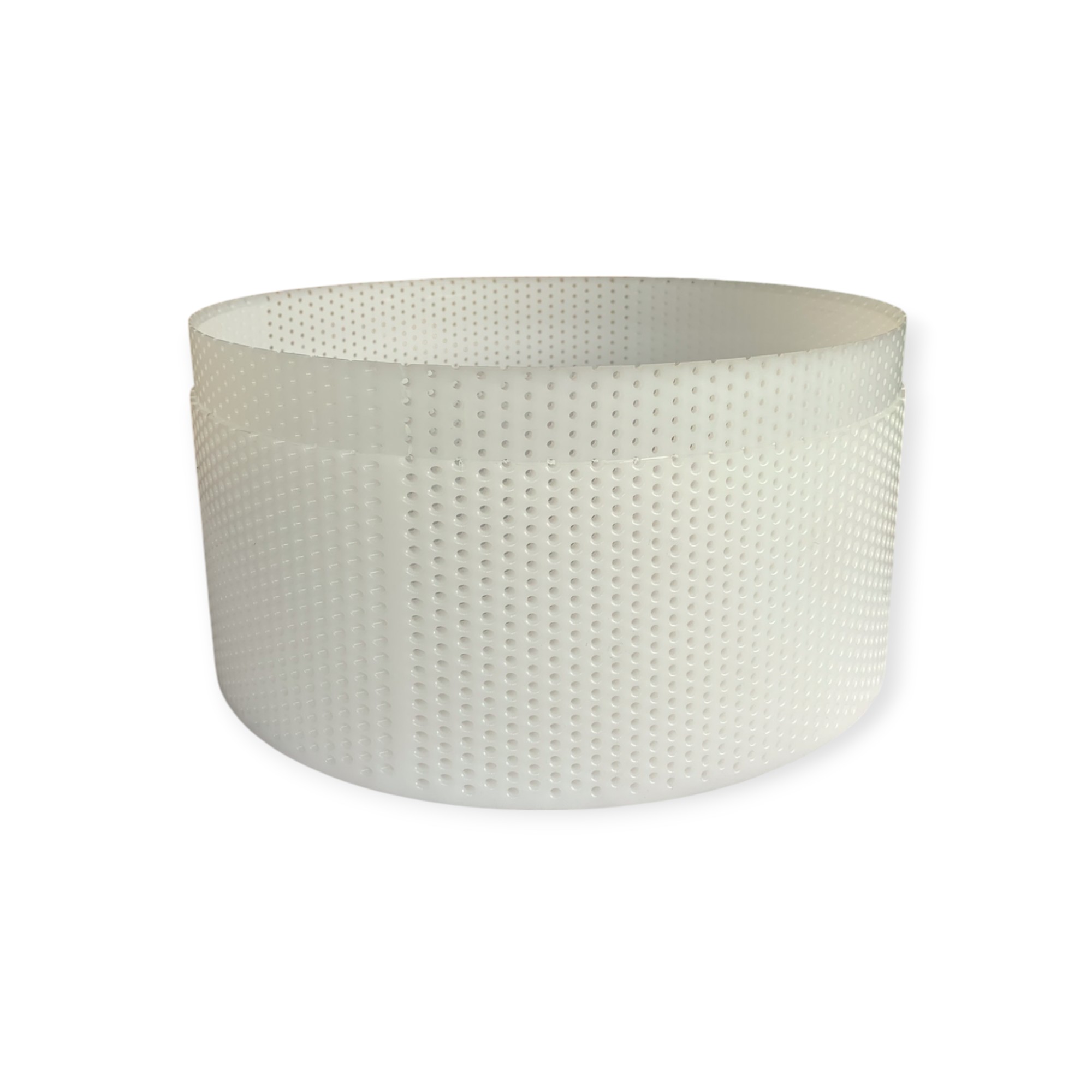 Удлиняющая форма для сыра P00776SOP Anelli Lodi на 5000 грамм. Дополнительная удлиняющая форма накладывается на основную форму для увеличения количества единовременной загрузки сырного зерна. Моется и дезинфицируется средствами, разрешенными для молочной промышленности. Схема мойки следующая: 1. Предварительная мойка при температуре 30-40°C-для удаления остатков продукта. 2. Дезинфекция в щелочной среде (при температурах и концентрациях, рекомендованных производителем чистящих средств). 3. Промывка в чистой воде. Материал: пищевой полипропилен. Размеры формы: верхний диаметр – 305 мм, нижний диаметр – 310 мм, высота – 155 мм.